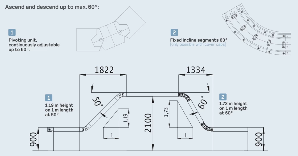 Известные и проверенные стандартные элементы, такие как приводы, колена, поворотные устройства, телескопы для подъёмных систем и промежуточные приводы для больших секций конвейера, могут быть интегрированы без точек перегрузки. Обратитесь к нам, чтобы узнать о возможностях создания индивидуального решения, разработанного специально для вас.