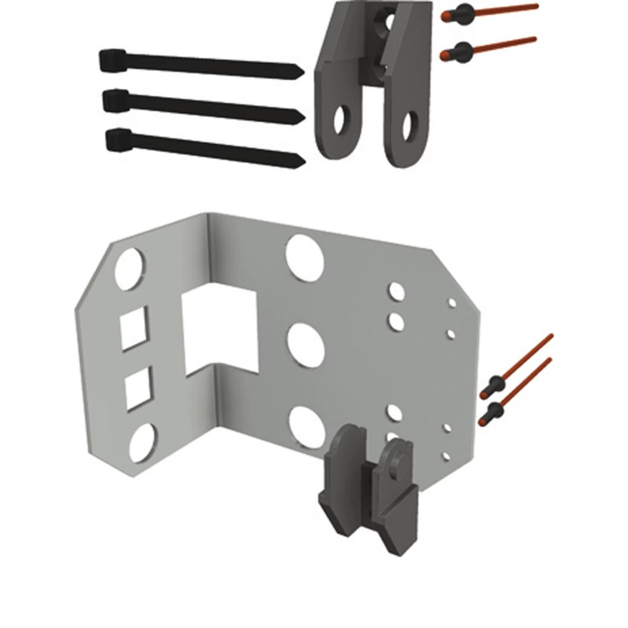 Монтажный комплект для крепления держателя кабеля к направляющему блоку или кронштейну держателя кабеля для трубчатых двигателей RB40 и RB50 для использования в теплицах. Монтажный комплект состоит из двух концевых зажимов для держателя кабеля, 4 заклепок и 3 кабельных стяжек.