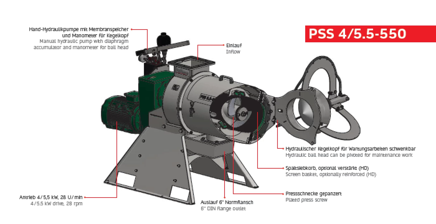 Прессовый шнековый сепаратор (PSS)Все в контакте с разделенными частями продукта А2 из нержавеющей стали 1.4301 - Редукторный двигатель 400В, 50 Гц, 1450 об / мин, 4,0 кВт (для разделения на 28% TS). или 5,5 кВт (для разделения AB28% TS) - Частота вращения выходного вала 28 об / мин - Макс:. Пропускная способность 30 м³ / ч (в зависимости от среды) - Клин выдвижные корзины изготовлены из нержавеющей стали V2A 1.4301 - Ширины зазора сетчатый фильтр: 0.20mm, 0.35mm, 0.50mm, 0.75mm, 1,00 мм, необязательно армированные (HD) - Пресс винт A2 нержавеющая сталь 1.4301 с карбидов вольфрама сварную наложения - Фланец для трубы или соединения воронки, соединение выпускной патрубок DN150 - 3-кратное уплотнительная к среде сальником - Дополнительное Маслопогруженные хранения для приема осевых сил включают смотрового стекла. - Нержавеющая сталь база 1.4301 V2A - БЕЗ распределительного устройства - Содержание: сепаратор, ходовая часть, Немецкий Инструкция по эксплуатации